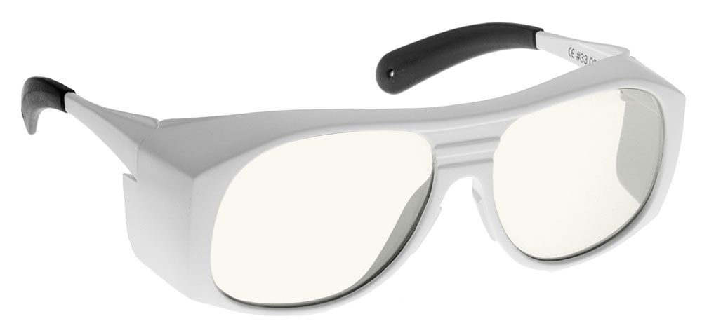 Medium universal-fit laser safety frame with adjustable temples and excellent side coverage. Comfortable over prescription glasses or worn alone. Available in black or white.
