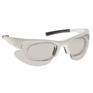Medium wrap-around laser safety glasses with sleek styling and 8 base lens curvature for full protection. Available in black or white. CE certified.